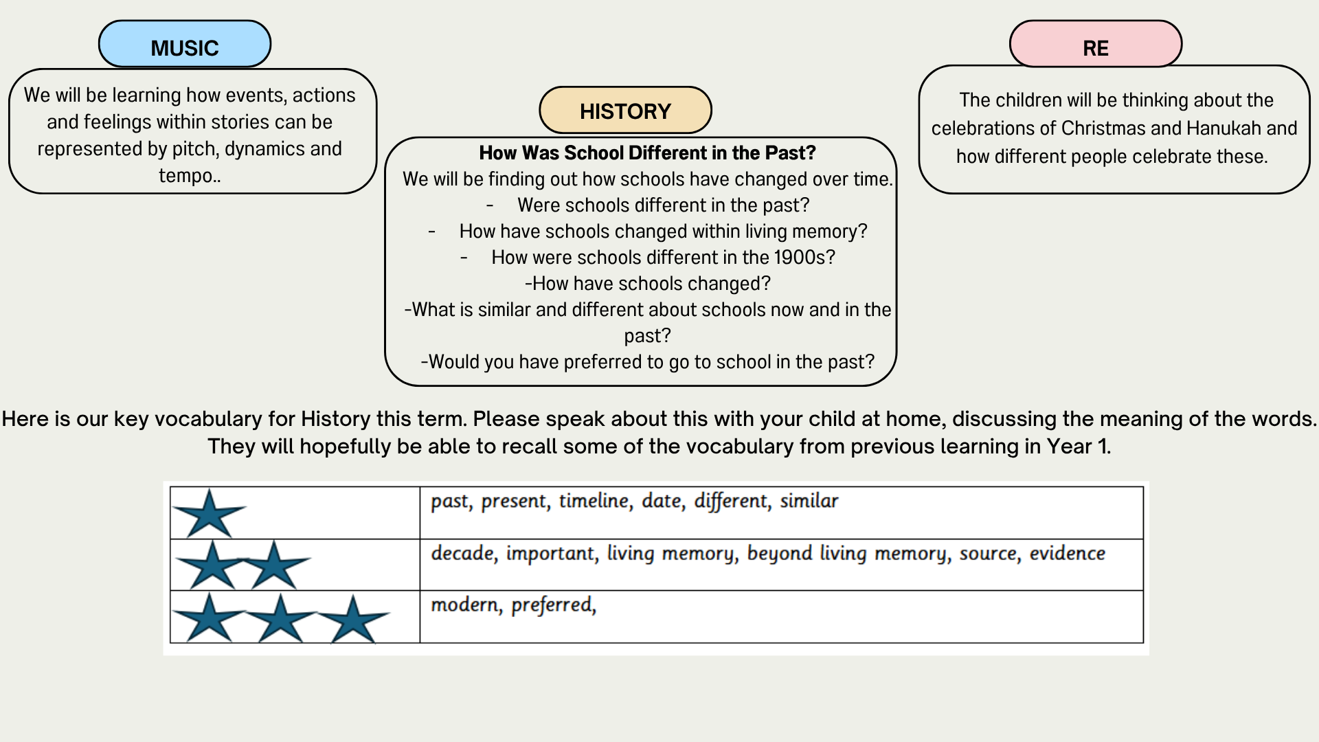 We are very excited about our new topic… ‘History of Schools' We will be taking a step back in time and looking at how schools have changed over time. We will even have some special guests talking about what The Oaks was like when it first opened.